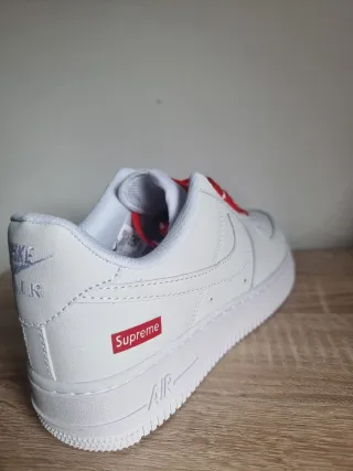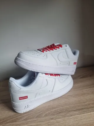 Zapatillas deportivas Nike Air Force 1 en colaboración con Supreme. Diseño icónico en color blanco con detalles rojos. - Cordones con logo Supreme. - Logo Supreme en el lateral. - Caja original incluida.