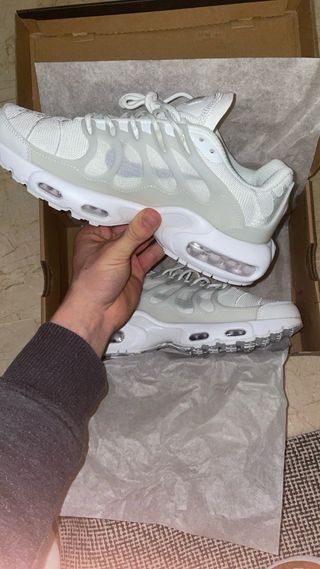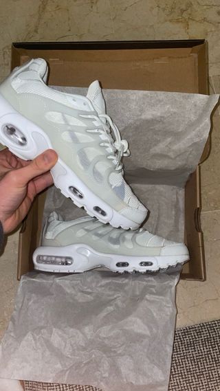 12 pares 30€ Nike TN Terrascape en color gris y blanco. Un diseño icónico con detalles modernos. - Tallas disponibles: 41, 42, 43, 44, 45. - Estilo retro con suela de aire visible.