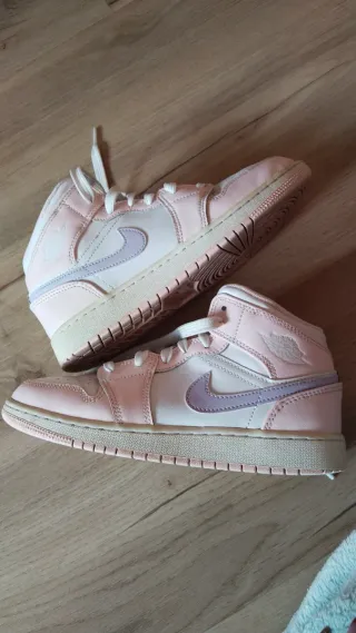 Zapatillas Nike Jordan Mid en tonos rosa y blanco. Un diseño clásico y versátil. - Combinación de colores pastel rosa palo, malva y blanco. - Logo de Jordan en el lateral. - Cierre con cordones. - Tienen algún rocecillo del uso (foto) pero están en buen estado.