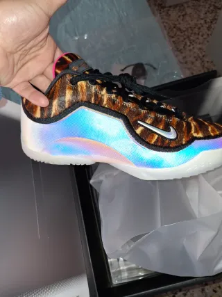 Zapatillas de baloncesto Nike con un diseño único. - Estampado animal print en la parte superior. - Detalles iridiscentes en la mediasuela. - Cierre con cordones negros. - Detalle rosa en el talón.
