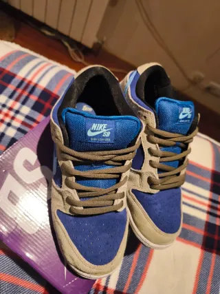 Zapatillas Nike SB Dunk con un diseño moderno y llamativo. - Combinación de colores beige y azul. - Detalle de swoosh en contraste. - Suela con motas.