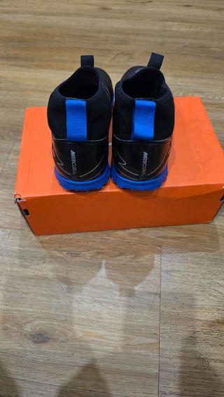 Zapatillas Nike Air Zoom sin estrenar, talla 38. El diseño es moderno y llamativo. - Color principal negro con detalles en azul. - Cierre sin cordones. - Suela con tacos para césped artificial.