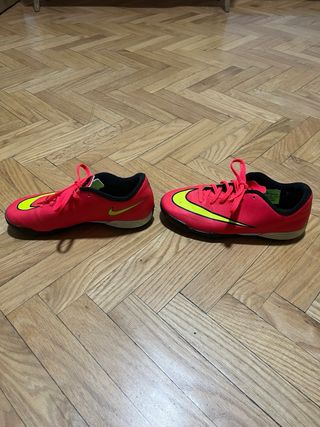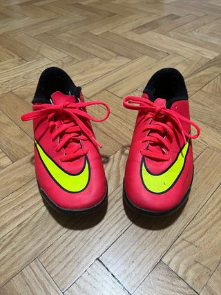 Zapatillas de fútbol Nike con un diseño llamativo. - Color principal rojo vibrante. - Detalle del icónico swoosh en amarillo. - Cordones rojos a juego. Talla 38 Venta en mano , NO HAGO ENVÍOS 📦 Precio negociable