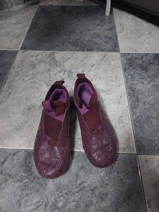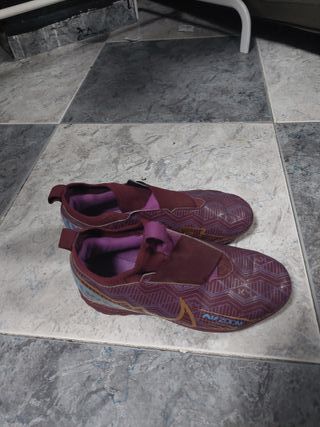 Zapatillas deportivas Nike en talla 35. Presentan un diseño llamativo con detalles geométricos. - Cierre elástico para un ajuste cómodo. - Combinación de colores morado y detalles en púrpura.