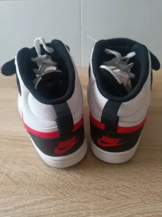 Zapatillas altas de la marca Nike con un diseño moderno. - Combinación de blanco y negro. - Cierre de velcro. - Logo de Nike en rojo.