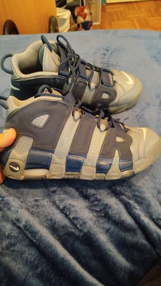 Zapatillas deportivas Nike Air More Uptempo en tonos grises y azules. Un diseño icónico con detalles llamativos. perfecto estado solo hay que ver las plantillas originales como nuevas. solo el color azul un poco desgastado de la suela del roce del pantalon y de conducir con ellas. - Cierre con cordones. - Tiradores en lengüeta y talón. - Swoosh de Nike en el lateral y puntera. talla 43 41 euros telefono 654013118