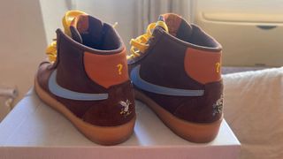 Zapatillas altas Nike SB Blazer Mid con cordones amarillos. - Exterior de ante marrón. - Swoosh lateral en color azul claro. - Detalle naranja en la lengüeta con logo. - Suela de goma marrón.