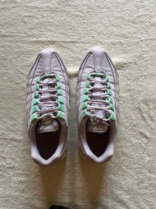 Zapatillas deportivas Nike Air Max en talla 39. Combinan tonos morados y verdes para un look moderno. - Diseño con capas superpuestas. - Cordones para un ajuste seguro. - Suela con amortiguación característica.