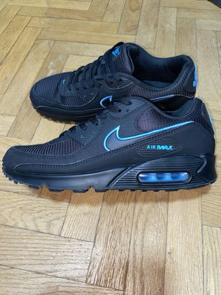 Zapatillas Nike Air Max 90 en perfecto estado. Solo puestas una vez, se puede apreciar en el buen estado de la suela y la zapatilla en general. Color negro y azul. Talla 45.