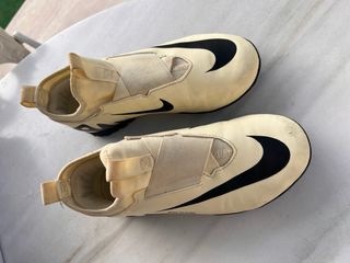 Zapatillas de fútbol Nike en color beige con detalles en negro. - Talla 38. - Diseño sin cordones con banda elástica. - Logo de Nike en contraste.