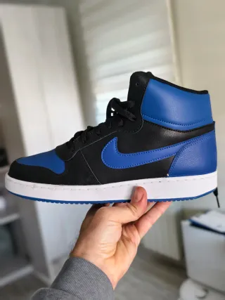 Zapatillas altas de la marca Nike en talla 44. Combinan cuero negro con detalles en azul vibrante. -Originales compradas en Nike Store. - Diseño de caña alta. - Swoosh lateral en azul. - Suela blanca. - Cordones negros.