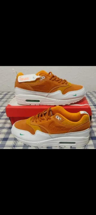 Zapatillas Nike Air Max 1 con un diseño moderno y llamativo. - Combinación de colores naranja y blanco. - Detalles en verde. - Suela blanca con cámara de aire visible. - Caja original un poco chafada al comprarla x envío pero las zapatillas están intactas.