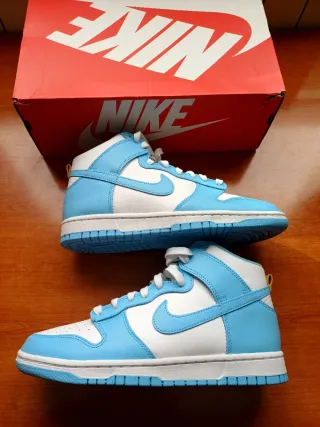 Zapatillas deportivas Nike Dunk con un diseño clásico y llamativo. - Combinación de colores azul y blanco. - Cordones de color azul. - Suela de goma.