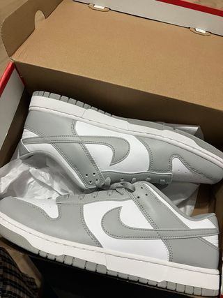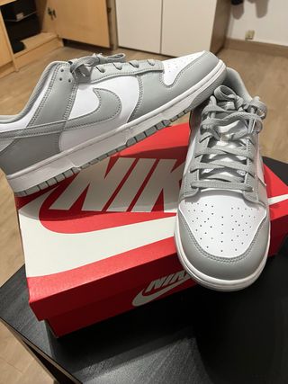 Zapatillas Nike Dunk Low para jóvenes en talla 38. - Diseño clásico con paneles superpuestos. - Combinación de colores gris y blanco. - Cordones blancos. - Swoosh característico de Nike.