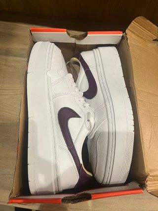 Zapatillas de caña baja con un diseño moderno y detalles únicos. - Parte superior de cuero blanco texturizado. - Swoosh de Nike en color morado. - Detalle en el talón en tono burdeos y amarillo. - Plataforma gruesa blanca. - 100% piel - me van pequeñas por lo que las vendo. Con solo 2-3 usos. #unisex