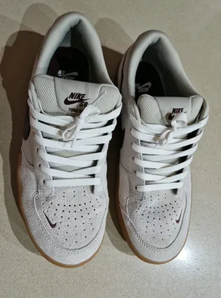 Zapatillas deportivas Nike SB Force 52 en color beige y detalles en marrón, talla 45. Perfectas para el día a día. Sin caja..📦 - Exterior de ante. - Suela de goma. - Cierre con cordones.