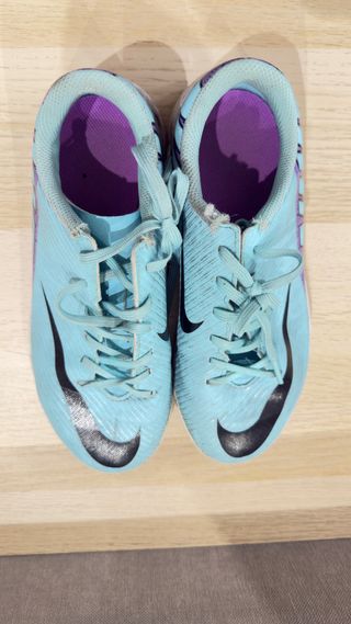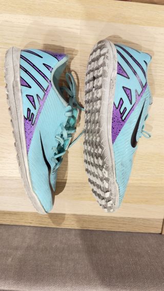 Zapatillas de fútbol para niño con un diseño llamativo. - Color principal azul claro. - Detalles en morado. - Marca Nike. usadas pero todavía se le pueden dar una segunda vida, tiene roces negros de las pistas de fútbol