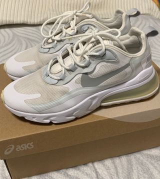 Zapatillas Nike Air Max 270 React en tonos grises y blancos. Diseño moderno y cómodo. - Parte superior de malla transpirable. - Unidad Air Max 270 visible en el talón. - Mediasuela React para una amortiguación suave.