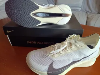 Zapatillas de running Nike ZoomX Vaporfly Next% 4. - Modelo especial JI para Jakob Ingebrigtsen. - Diseño en blanco y gris. - Suela con tecnología Flyplate.