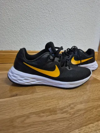 Zapatillas deportivas Nike con un diseño moderno y llamativo. - Combinación de colores negro y amarillo. - Logotipo de Nike en el lateral.