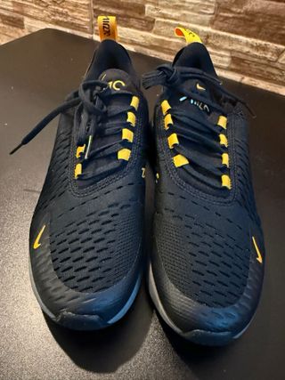 Zapatillas deportivas Nike Air Max 270 con un diseño moderno y llamativo. - Combinación de colores negro y amarillo. - Detalle del logo Swoosh plateado. - Suela con unidad Air Max visible.