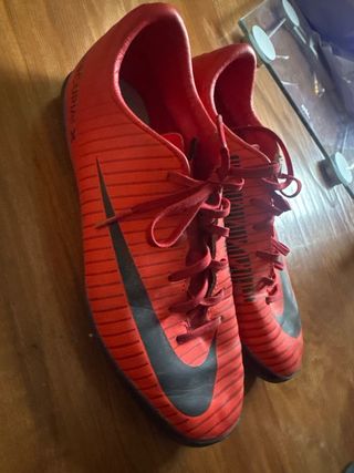Zapatillas de fútbol sala Nike con un diseño llamativo. - Color principal rojo con detalles en negro. - Cordones rojos. - Suela de goma.