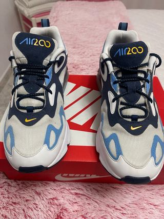 Zapatillas Nike Air Max 200 con un diseño moderno y llamativo. - Combinación de colores azul, blanco y detalles en amarillo. - Logo de Nike en el lateral. - Cierre con cordones.