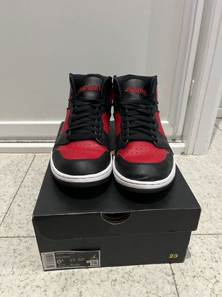 Zapatillas altas Nike Jordan en color negro y rojo. Un diseño clásico y deportivo. - Combinación de cuero negro y detalles en rojo. - Cuello alto para mayor soporte. - Suela blanca contrastante.