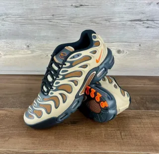 Zapatillas Nike Air Max Plus TN en color beige y marrón. Un diseño llamativo y moderno. Nueva a estrenar en su caja original intacta. Talla 43 Estado IMPECABLES ✨ - Parte superior con detalles ondulados. - Suela con unidades de amortiguación visibles. - Swoosh naranja característico.