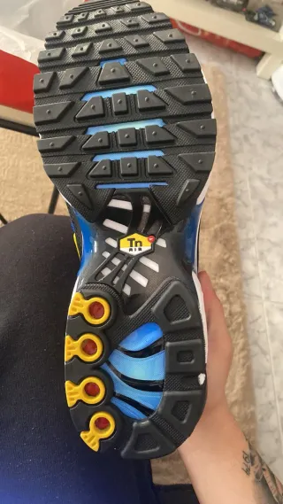 Zapatillas Nike TN con un diseño urbano y moderno, perfectas para el día a día. Su comodidad las hace ideales para cualquier ocasión. - Combinación de colores vibrantes en azul, verde y negro. - Detalle de logo Swoosh en blanco. - Suela con tecnología de amortiguación visible. -Con algunos desperfectos poco visibles.