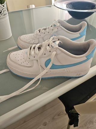 Vendo un par de zapatillas Nike Air Force 1. Son de color blanco y azul, talla 40. Están en buen estado, aunque presentan un ligero desgaste por el uso. - Diseño clásico y atemporal. - Cómodas y ligeras. - Perfectas para el día a día.