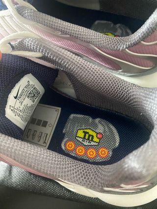 Tenis Nike TN AIR con un diseño degradado en tonos rosas y grises. - Detalles en color amarillo neón. - Suela blanca con cámaras de aire visibles. - solo tienen un USO