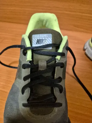 Zapatillas Nike Air Max en tonos verde oliva y negro. Ideales para un look casual y cómodo. Solo tiene un pequeño desperfecto en la goma como se muestra en la foto, pudiendose pegar y quedarian como nuevas. Sin caja. - Diseño moderno y ligero. - Suela resistente y duradera. - En muy buen estado. - Se venden dos zapatillas.