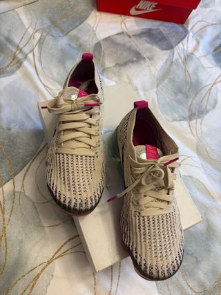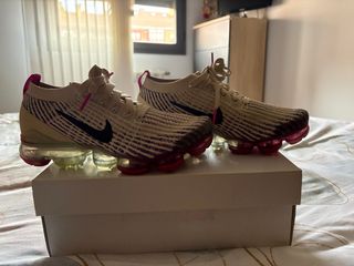 Zapatillas deportivas Nike Air VaporMax 3 en color beige con detalles en rosa. - Diseño moderno y ligero. - Suela con tecnología de amortiguación visible. - Tejido transpirable. Puestas muy pocas veces, casi a estrenar