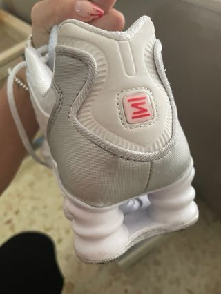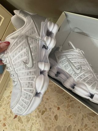 Zapatillas deportivas Nike Shox en talla 41. Diseño moderno y cómodo. - Combinación de colores blanco y plateado. - Parte superior de malla transpirable. - Suela con tecnología Shox para amortiguación.