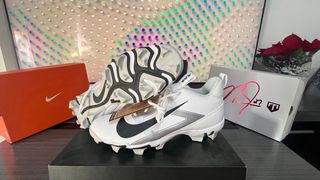 Zapatillas de béisbol Nike en tonos grises y blancos. Diseñadas para el juego. - Suela con tacos para tracción. - Diseño deportivo y moderno. - Cierre de cordones.