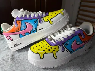 Zapatillas deportivas Nike Air Force 1 personalizadas con un diseño único y colorido. - Diseño tipo drip con salpicaduras. - Combinación de colores vibrantes: naranja, amarillo, azul, morado y rosa. - Detalles en negro para un acabado tipo cómic. - Base blanca clásica de las Air Force 1.