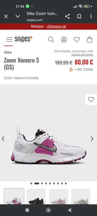 Zapatillas deportivas Nike Zoom Vomero 5. - Diseño en blanco y morado. - Talla GS. Se venden nuevas a estrenar. Bambas originales. Se compraron para reyes y se me ha pasado el periodo de devolución. Compradas a través de privando zale; se puede enseñar factura sin problema.