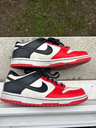 Zapatillas deportivas Nike Dunk Low. - Combinación de colores rojo, negro y blanco. - Diseño clásico de caña baja.
