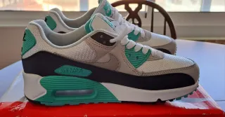 Zapatillas deportivas Nike Air Max con un diseño moderno y llamativo. - Combinación de colores blanco, gris y verde azulado. - Detalle del logo de Nike en la lengüeta y el lateral. - Suela con tecnología Air Max visible.