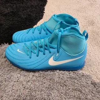 Zapatillas deportivas Nike Phantom GX en tonos azules y blancos. Diseñadas para ofrecer un buen agarre y control en el campo. - Parte superior blanca con detalles en azul turquesa. - Swoosh de Nike en color rosa fucsia. - Suela negra con tacos. - Utilizadas un par de veces. Practicamente nuevas.
