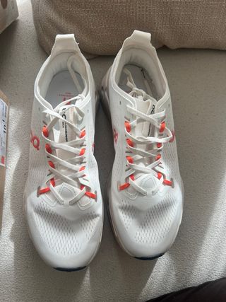 Zapatillas deportivas estilo On Running en color blanco con detalles en naranja. Están nuevas. Son ligeras y cómodas, perfectas para caminar, gimnasio o uso diario. Talla: 44 Incluyen caja como se ve en las fotos. Se venden porque no se usan. Si necesitas más fotos o información, escríbeme sin problema 😊