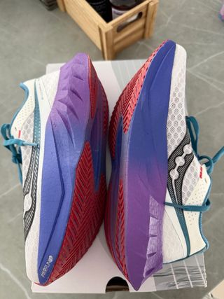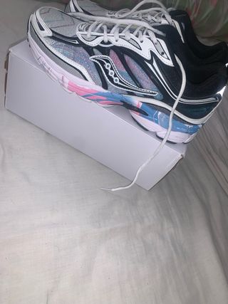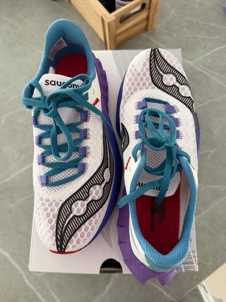 Zapatillas deportivas Saucony en blanco y morado, perfectas para correr. - Diseño moderno y llamativo. - Suela con buen agarre. - Tejido transpirable.