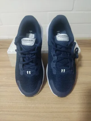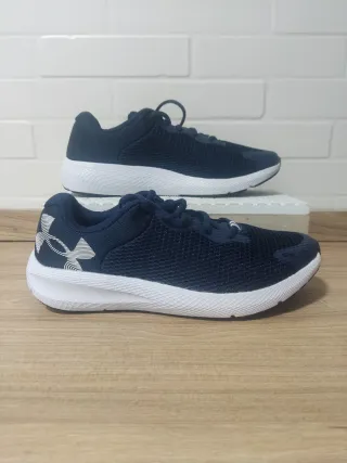 Zapatillas deportivas de la marca Under Armour en color azul con detalles blancos. Perfectas para el día a día o para hacer deporte. - Modelo Charged Pursit 2 BL. - Diseño moderno y ligero. - Amortiguación con tecnología Charged Cushioning. - Material exterior de malla ligera y transpirable. Plantillas de espuma. - Suela blanca de goma. - Logo de la marca en el lateral.