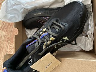 Zapatillas deportivas Asics con un diseño moderno y llamativo. - Combinación de colores negro y verde. - Cierre con cordones. - Parte superior de malla transpirable. Están nuevas, solo se gan utilizado un par de ves o tres.. En su caja original.