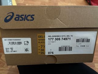 Zapatillas deportivas Asics con tecnología Gore-Tex. - Diseño en negro con detalles multicolores. - Materiales de alta calidad. - repelentes al agua - específicas para terreno externo lluvia y barro