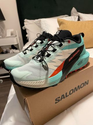 Zapatillas Salomon modelo Sense Ride 5 W para mujer Talla: 39 1/3 - 7.5 USA Usadas una vez - Diseño deportivo. Color verde turquesa, con detalles en naranja y blanco. - Cierre con cordones elasticos y cierre oculto -Zapatilla de trail versátil. - Muy cómoda, se adapta fácilmente a diversos terrenos, con una entresuela equilibrada que ofrece amortiguación y respuesta y una pala de Engineered Mesh con SensiFit™ para ofrecer una sujeción cómoda y precisa.