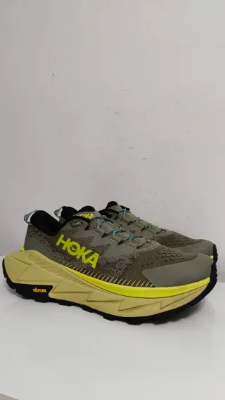Zapatillas Hoka con un diseño moderno y llamativo. - Combinación de colores verde oliva y amarillo. - Suela con tecnología Vibram.