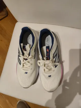 Zapatillas de running New Balance para mujer en color blanco con detalles en rosa y azul. - Usadas dos veces en cinta de gimnasio. - Se venden porque no se amolda al pié de mi chica. - Diseño moderno y ligero. - Suela con tecnología Fresh Foam.