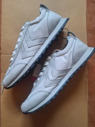 Zapatillas deportivas Hummel en color beige y gris, talla 38. Vienen con su etiqueta original. - Diseño moderno con detalles en ante. - Suela de goma duradera.